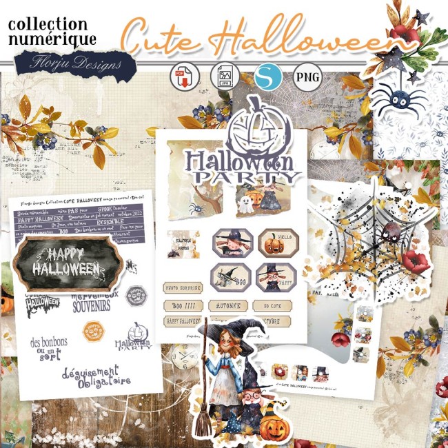 Le pack complet papiers A4 ou 30x30 ( à choisir dans le menu déroulant ) bénéficie d'une promotion comprend les 8 packs ( 3 packs papiers et 5 packs éléments ) de la collection Cute Halloween imprimable et un pack bonus gratuit dont l'aperçu est ci dessous, comprenant 1 feuille à découper ( 2 cartes 15x10cm , 4 dies cuts "timbre" ) et 2 papiers A4 et 30x30cm. Print & cut silhouette inclus pour la feuille à découper .