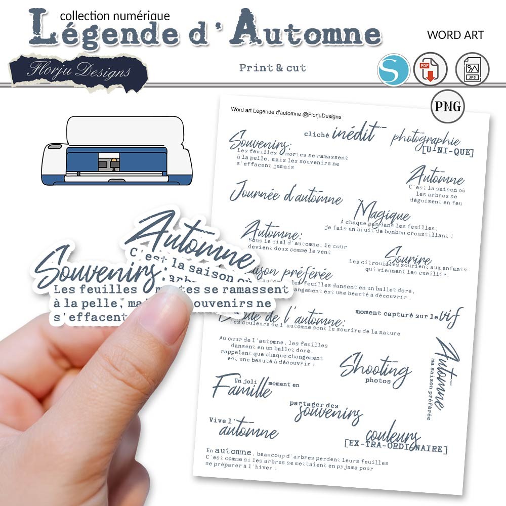 Fichier PNG ( fond transparent ) de chaque mot / texte, vous pourrez choisir les mots et créer votre page à imprimer dans canva par exemple ou autre logiciel . Vous pourrez les importer dans le DS de cricut et créer un print then cut