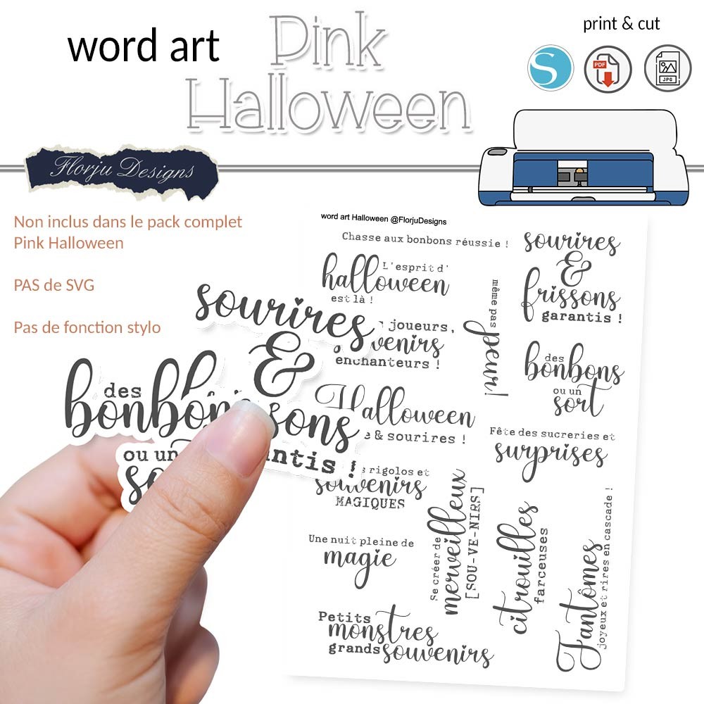 - Fichier PNG ( fond transparent ) de chaque mot / texte, vous pourrez choisir les mots et créer votre page à imprimer dans canva par exemple ou autre logiciel . Vous pourrez les importer dans le DS de cricut et créer un print then cut