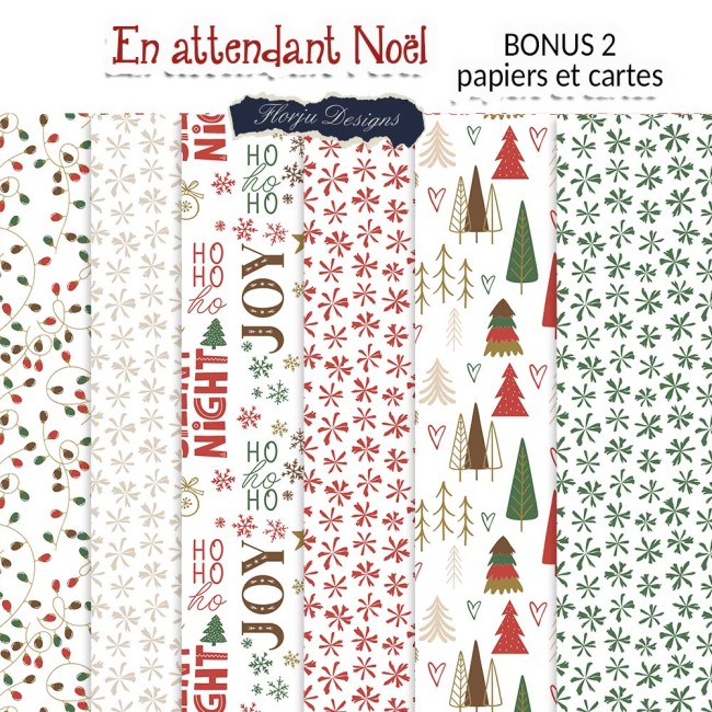 - le pack bonus 2 offert : 7 papiers (1 papier scénique, et 6 papiers à motifs) au format A4, et carré ( 30x30cm et 20x20cm ) et 4 cartes 9x13cm ( 1 feuille A4 à imprimer )