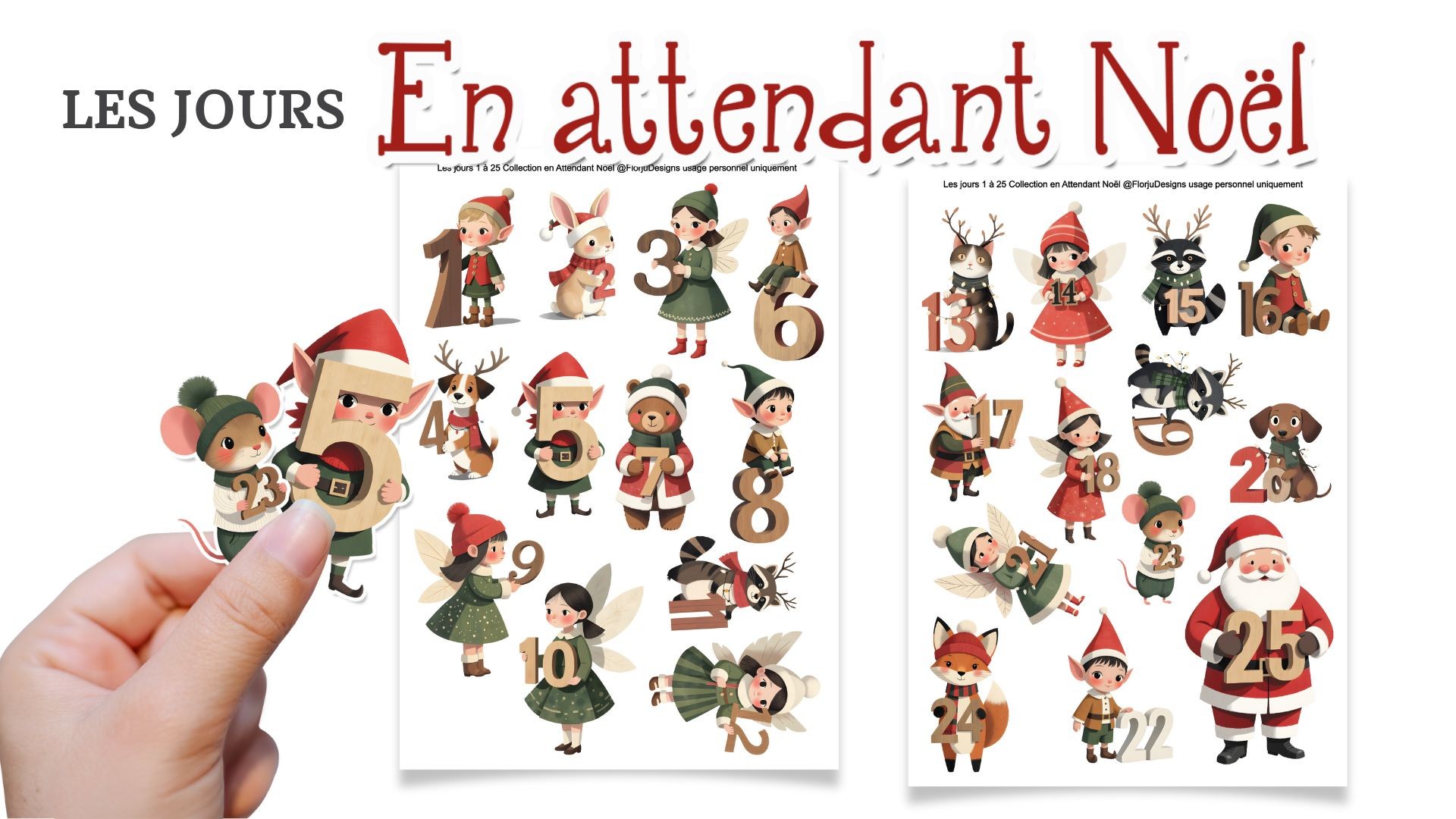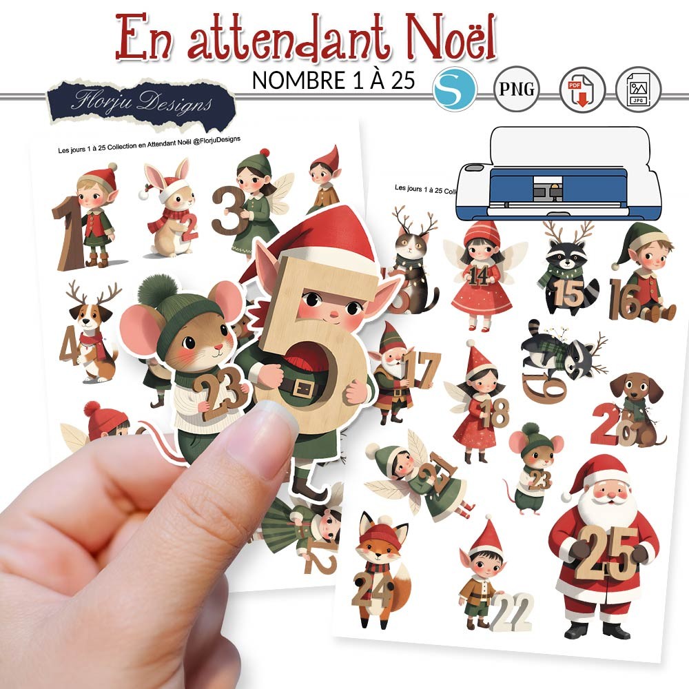 Je vous propose des dies cuts pour compléter la collection En Attendant Noël , si vous créer un journal de décembre de bébé ou jeune enfant , ces dies cuts sont parfaits . Il y a les jours 1 à 25 avec des illustrations de lutins, de fées, de ratons laveur, chat, lapin, souris .... et le jour 25 c'est le Père Noël