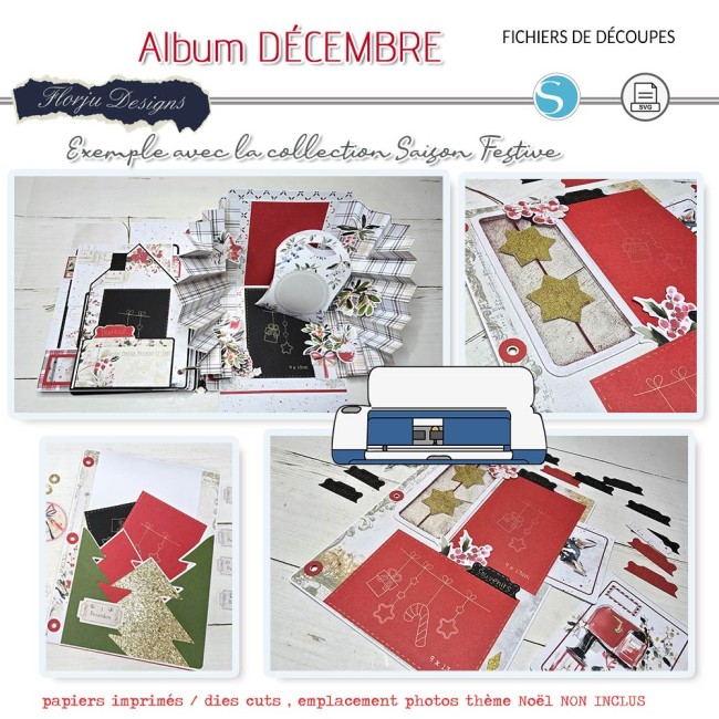 - les découpes à réaliser dans le cardstock et le papier imprimé de votre choix ( j'ai utilisé la collection aison Festive, les word art coordonnés et le pack emplacements photos thème Noël