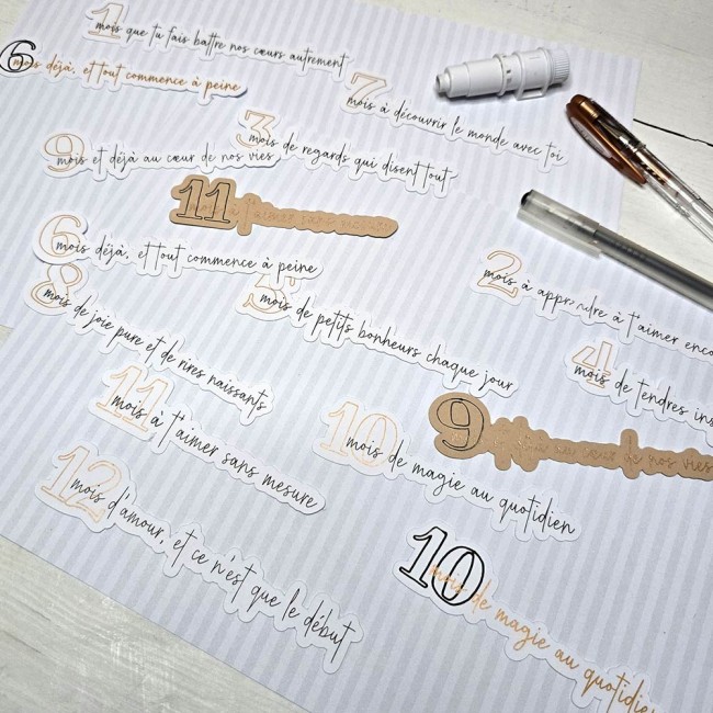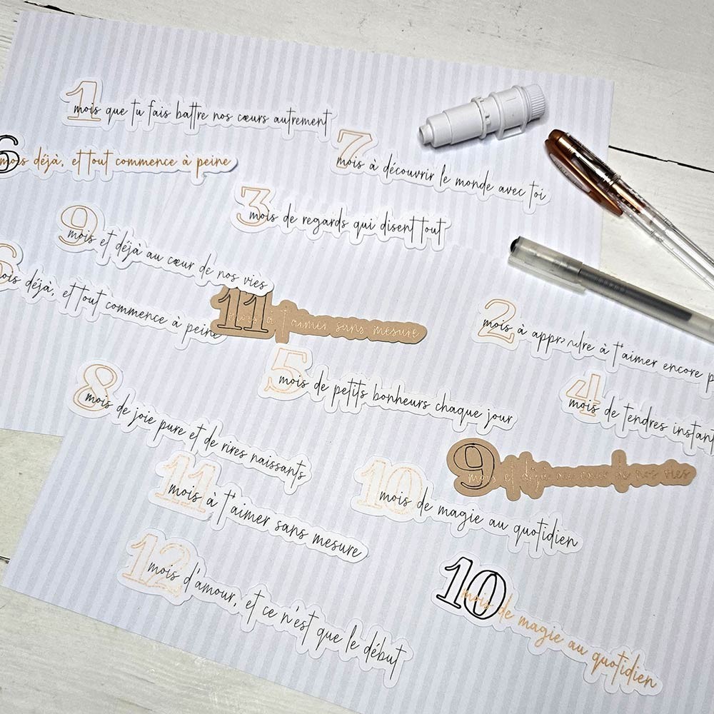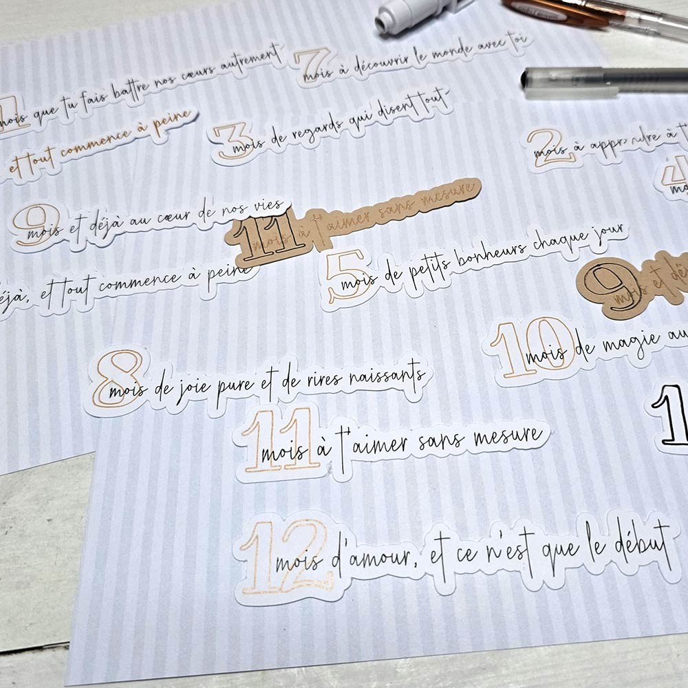 Ces petits textes, citations en français peuvent être disposés tout au long d'un album photos, sur des cartes étapes, sur le thème de bébé au fil des mois , de 1 à 12 mois