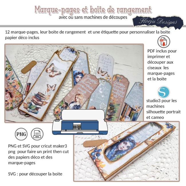 - fichier studio3, pour les machines Silhouette ( compatible portrait & caméo ) , print and cut des marques page et des papiers décoratifs à collés sur la base de la boite et découpe de la base de la boite dans le cardstock de votre choix